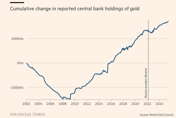 در نتیجه، تا سال ۲۰۲۵ سهم طلا در ذخایر جهانی به ۲۴% و سهم اوراق خزانه آمریکا به ۲۳% رسیده یعنی یک نقطه چرخش تاریخی در نظام مالی جهانی.