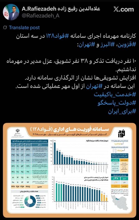 جهان صنعت نیوز، رفیعزاده در تازهترین گزارش خود از عملکرد سامانه فوریتهای اداری (فواد ۱۲۸)، در شبکه ایکس نوشت: در سه استان تهران، البرز و قزوین طی مهر ماه هیچ مورد عزل مدیریتی ثبت نشده و در مقابل، تعداد تشویقها نسبت به تذکرها افزایش یافته است.
