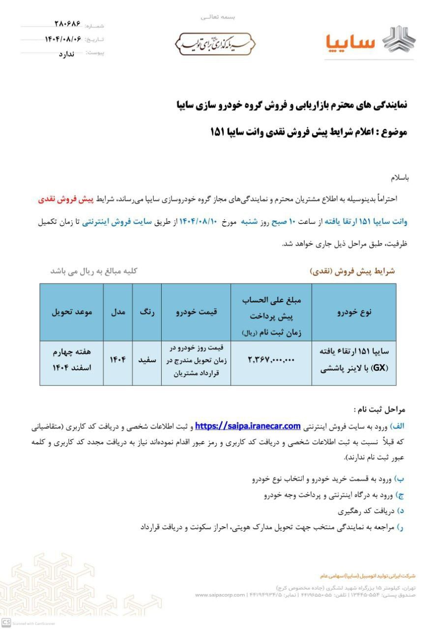 پیش فروش وانت سایپا ۱۵۱ از ساعت ۱۰ صبح روز شنبه مورخ ۱۰ آبان ۱۴۰۴ ماه آغاز خواهد شد.