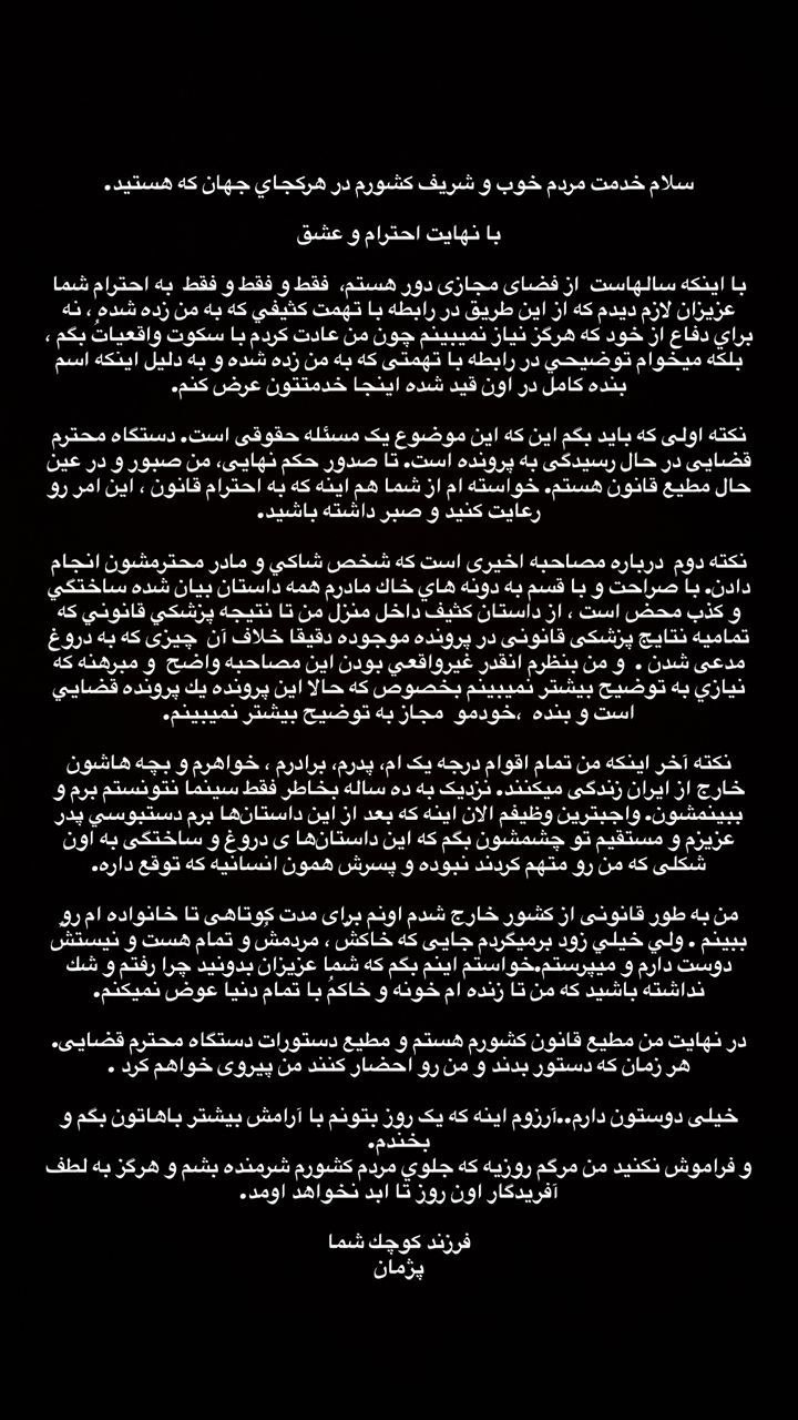 پژمان جمشیدی در پایان پیام خود بار دیگر تأکید کرد که تابع قانون است و در صورت احضار توسط مراجع قضایی، با تمام احترام حاضر خواهد شد. او همچنین از مردم خواست که قضاوت نکنند و با صبر، حقیقت را دنبال کنند.