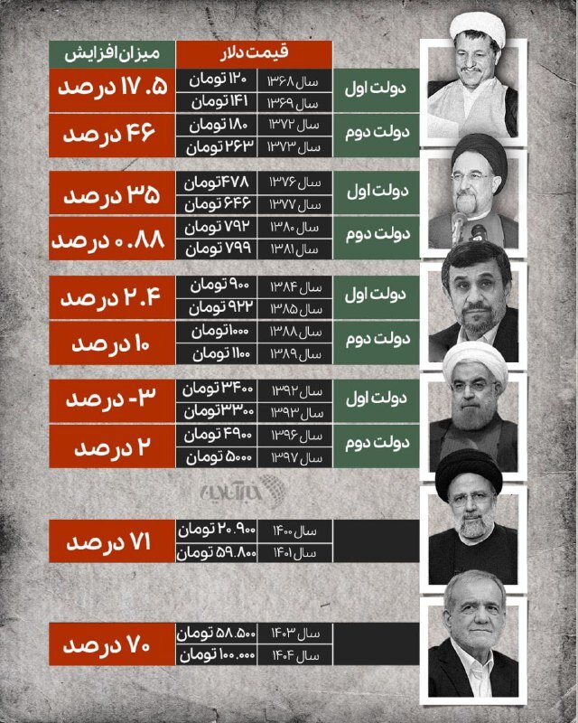 تغییر نرخ دلار در یک سال نخست ۱۴ دولت، مقایسه شده است؛ نمودی از وعده‌های کنترل تورم تا واقعیت بازار آزاد. نوسانی که هر بار با سیاستی تازه آغاز شد و در نهایت، مسیر خود را ادامه داد.