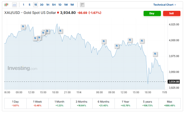 طلا در لحظه نگارش این گزارش در نرخ ۳۹۳۴ دلار در معامله بود.