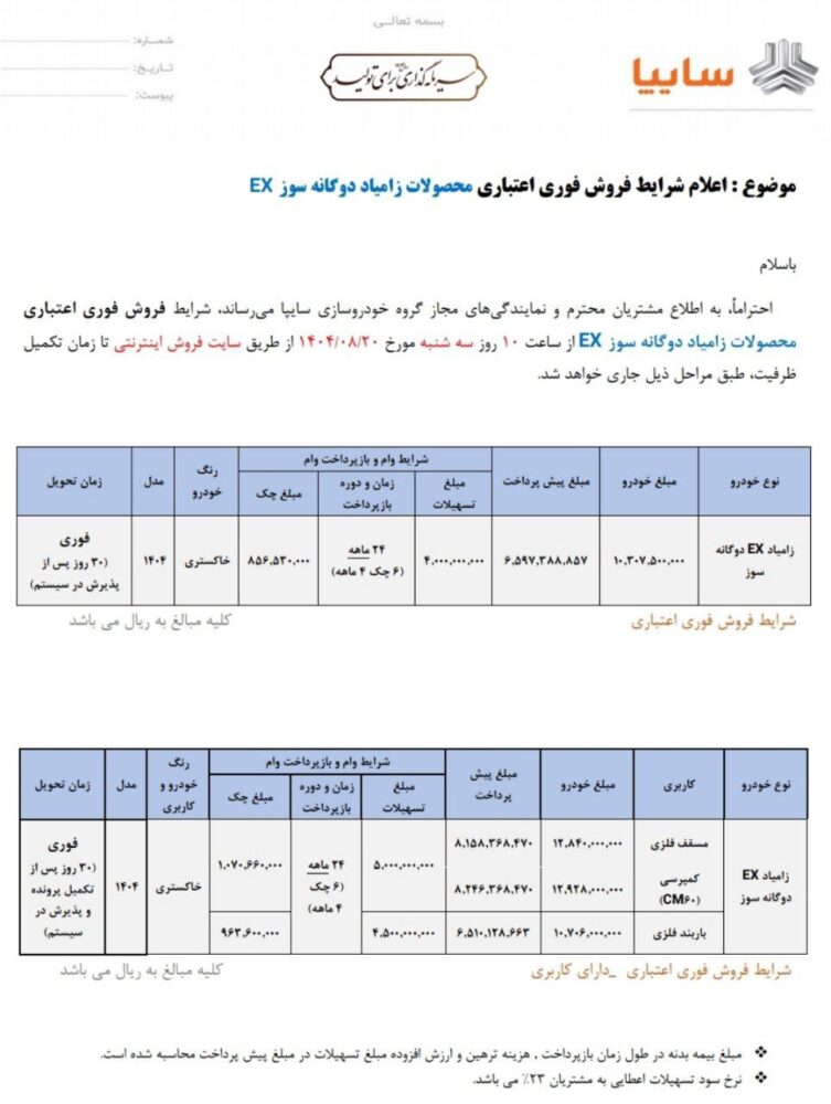 جهان صنعت نیوز، شرکت زامیاد زیرمجموعه خودرو سازیی سایپا دومین خودروساز بزرگ کشور شرایط فروش فوری کامیونت ارتقاء یافته خود را در سه تیپ اعلام کرد. در این شرایط فروش وانت نیسان آبی ارتقاء یافته با تیپ دوگانه سوز عرضه می شود. طرح فروش زامیاد EX به صورت فوری و موعد تحویل ۳۰ روزه است. نسخه دوگانه سوز زامیاد EX با کاربری رایج به صورت نقدی عرضه می شود و نسخه کمپرسی، مسقف فلزی و باربند دار این خودرو به صورت اعتباری عرضه می شود. قیمت قطعی اعلامی سایپا برای زامیاد EX دوگانه سوز یا همان نیسان آبی ارتقاء یافته دوگانه سوز ۱,۰۳۰,۷۵۰,۰۰۰ تومان است و نسخه سقف فلز ۱,۲۸۴,۰۰۰,۰۰۰ و کمپرسی ۱,۲۹۲,۸۰۰,۰۰۰ تومان است و نسخه باربند دار ۱,۰۷۰,۶۰۰,۰۰۰ عرضه می شود. زامیاد EX نمونه بروزرسانی شده و یا استاندارد شده از وانت نیسان معروف است که بعد از چالش های فراوان سازمان استاندارد و سایپا این شرکت دست به توسعه این تیپ از نیسان آبی را داد.