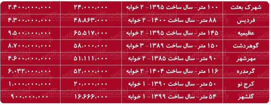 یک واحد یکخوابه در گلشهر کرج نیز کمتر از یک میلیارد برای فروش قیمت خورده است.