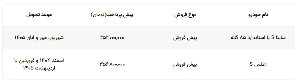 جهان صنعت نیوز، شرکت سایپا شرایط پیش فروش دو محصول سدان و هاچبک خود را ویژه آذر ماه ۱۴۰۴ اعلام کرد. در این شرایط فروش سایپا اطلس S و ساینا S با استاندارد ۸۵ گانه به صورت پیش فروش عرضه می شود. موعد تحویل اعلامی برای اطلس S برای اسفند ۱۴۰۴ و فروردین تا اردیبهشت ۱۴۰۵ است. موعد تحویل اعلامی برای ساینا S با استاندارد ۸۵ گانه برای شهریور، مهر و آبان ۱۴۰۵ است. متقاضیان ثبت نام اطلس اس باید پیش پرداخت ۳۵۶ میلیون تومانی و برای ساینا S با استاندارد ۸۵ گانه مبلغ ۲۵۲,۰۰۰,۰۰۰ تومان پرداخت نمایند.