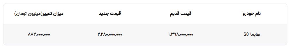 جهان صنعت نیوز، شرکت ایران خودرو قیمت جدید گران ترین کراس اوور مونتاژی خود ویژه آذر ماه ۱۴۰۴ اعلام کرد. قیمت هایما S8 افزایش ** میلیون تومانی تجربه کرده است. ایران خودرو پیش از این افزایش قیمت، هایما 8S را با قیمت ۱,۳۹۸,۰۰۰,۰۰۰تومان عرضه می کرد که با افزایش بها، قیمت آن در آذر ماه به ۲,۲۸۰,۰۰۰,۰۰۰ تومان رسیده است.
