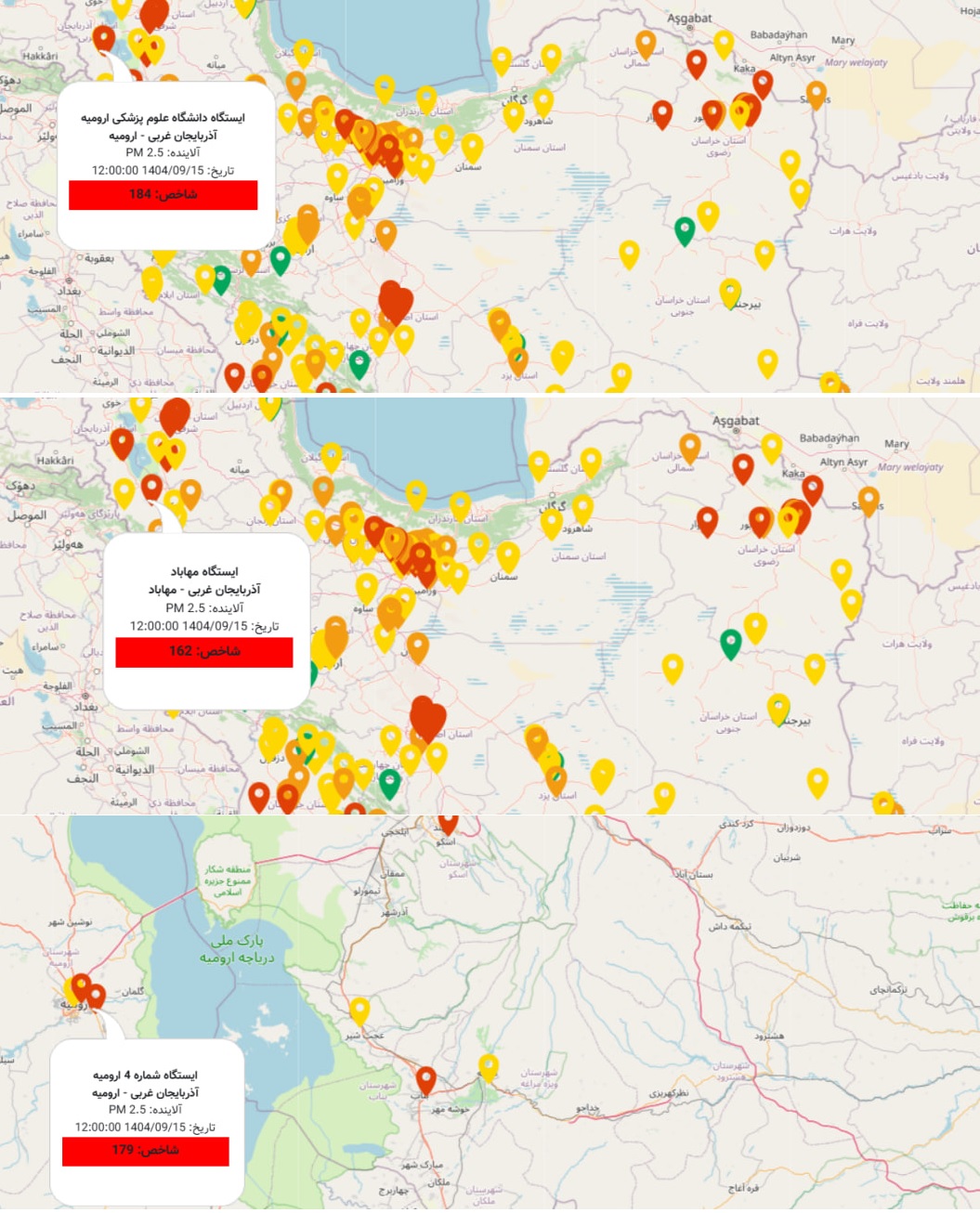 بر طبق اعلام اپلیکیشن پایش کیفی هوای کشور، شاخص کیفی هوای ارومیه، ظهر امروز در دو ایستگاه شاخص کیفی این شهر برابر ۱۸۴ و ۱۷۹ و در وضع ناسالم و در یکی از ایستگاههای شهر مهاباد برابر ۱۶۲ و در وضع ناسالم است.