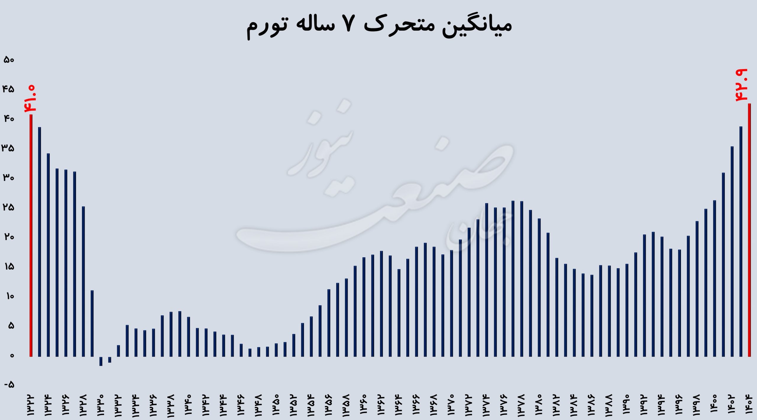 برای ترسیم روشنتر فشار تورمی واردشده بر خانوار، بهجای بررسی روند تورم سالانه، میانگین متحرک هفتساله تورم مورد توجه قرار میگیرد. براساس این شاخص، میانگین تورم هفتسالِ منتهی به آبان ۱۴۰۴ به حدود ۴۳ درصد رسیده است. به بیان دیگر، هزینه زندگی یک خانوار ایرانی در هفت سال گذشته، هر سال بهطور متوسط ۴۳ درصد افزایش یافته است. چنین آهنگ افزایشی در ۸۰ سال اخیر سابقه نداشته و از نظر تاریخی یک رکورد بیبدیل محسوب میشود.