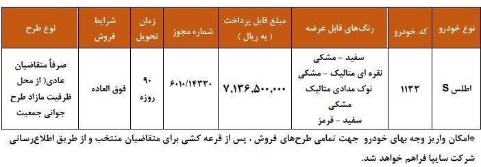 فروش فوق العاده خودرو اطلس S در قالب طرح متقاضـیان عادی (از محل مازاد طرح حمایت از خانواده و جوانی جمعیت) آغاز شد.