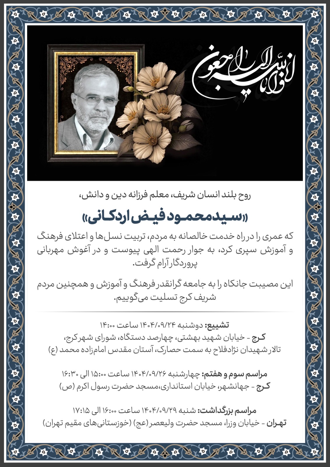 این ضایعه را به همشهریان پرافتخار اردکانیام که مهد پرورش فیض هاست و مردمان شریف کرج، فرهنگیان ارجمند، خاندان معزز فیض اردکانی،همسر محترمه و وفادار ایشان و فرزندان گرانقدرش تسلیت می گویم.
