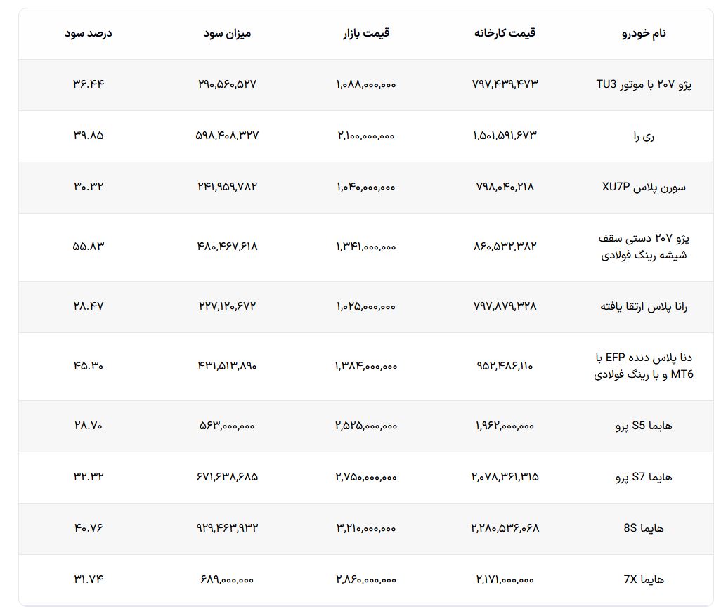 همانطور که گفته شد، در این شرایط فروش دو روش عرضه فروش فوری و پیش فروش را داریم. از آنجا که تحویل خودروهای پیش فروش شده حداقل چهار ماه بعد و با قیمت نهایی روز محاسبه می شود، پس مبنای محاسبه سود را باید بر اساس فروش فوری در نظر گرفت. پس در عمل محاسبه سود برای خودروهای پژو ۲۰۷ با موتور TU3، ری را، سورن پلاس XU7P، پژو ۲۰۷ دنده دستی سقف شیشه ای با رینگ فولادی، رانا پلاس ارتقا یافته، دنا پلاس دنده دستی EFP با گیربکس MT6 و با رینگ فولادی، هایما S5 پرو، هایما S7 پرو، هایما 8S و هایما 7X انجام می شود. در جدول زیر سود ناشی از خرید این خودروها از کارخانه را محاسبه کرده ایم :
