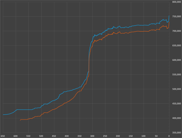 نمودار زیر روند افزایش قیمت اسکناس و حواله دلار آمریکا را در ۶۵۰ و ۵۸۴ روز کاری گذشته نشان میدهد. نمودار آبی نرخ اسکناس و نمودار نارنجی نرخ حواله دلار بر حسب ریال است.