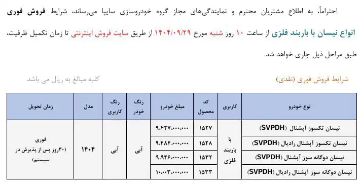 شرکت زامیاد زیر مجموعه سایپا شرایط فروش وانت کار و تجاری نیسان آبی را با چهار کاربری ویژه آذر ۱۴۰۴ اعلام کرد.
