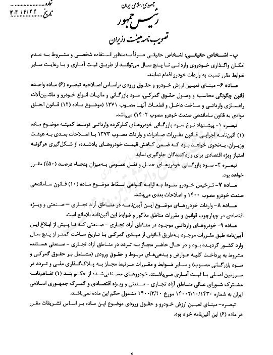 بخشنامه سازمان توسعه تجارت ایران درخصوص اصلاحیه آیین نامه اجرایی بند ر تبصره 1 ماده واحده قانون بودجه سال 1404 کل کشور (حقوق ورودی واردات خودروی شخصی ایرانیان خارج از کشور) ابلاغ شد.