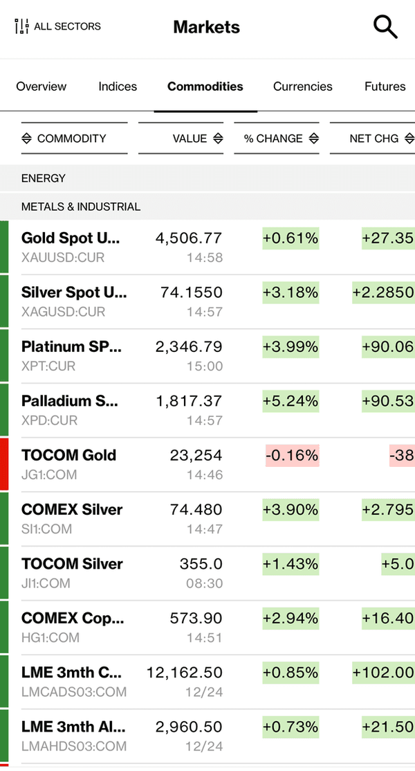 با اینکه خریدهای بازار فلزات روی نقره و پلاتین است اما بازار طلا نه به‌ دلیل تقاضای واقعی بلکه به‌خاطر ترس از جا ماندن سرمایه‌گذاران و تنش‌های ژئوپلتیکی داغ شده است.