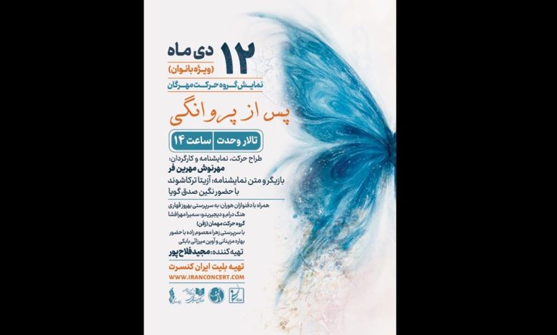 نمایش گروه حرکت مهرگان با عنوان «پس از پروانگی» ویژه بانوان، روز جمعه ۱۲ دیماه ۱۴۰۴ ساعت ۱۴ در تالار وحدت تهران روی صحنه میرود. این اثر زیبای نمایشی با طراحی حرکت،نمایشنامه و کارگردانی مهرنوش مهرینفر و تهیهکنندگی مجید فلاحپور اجرا میشود.