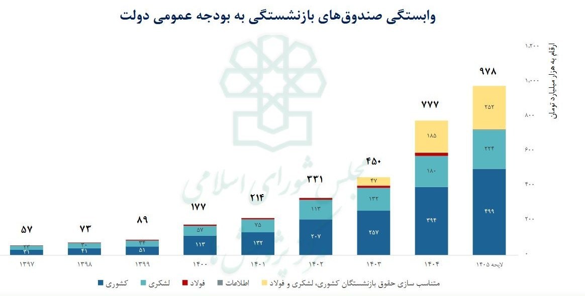 در لایحه بودجه سال 1405 بودجه صندوق‌های بازنشستگی به 978 همت رسیده است. بر این اساس 19 درصد از بودجه عمومی کشور صرف کمک به صندوق‌های بازنشستگی می‌‌شود؛ این در حالی است که این صندوق‌ها باید در بخش درآمد و منابع، مستقل از بودجه عمومی دولت باشند.