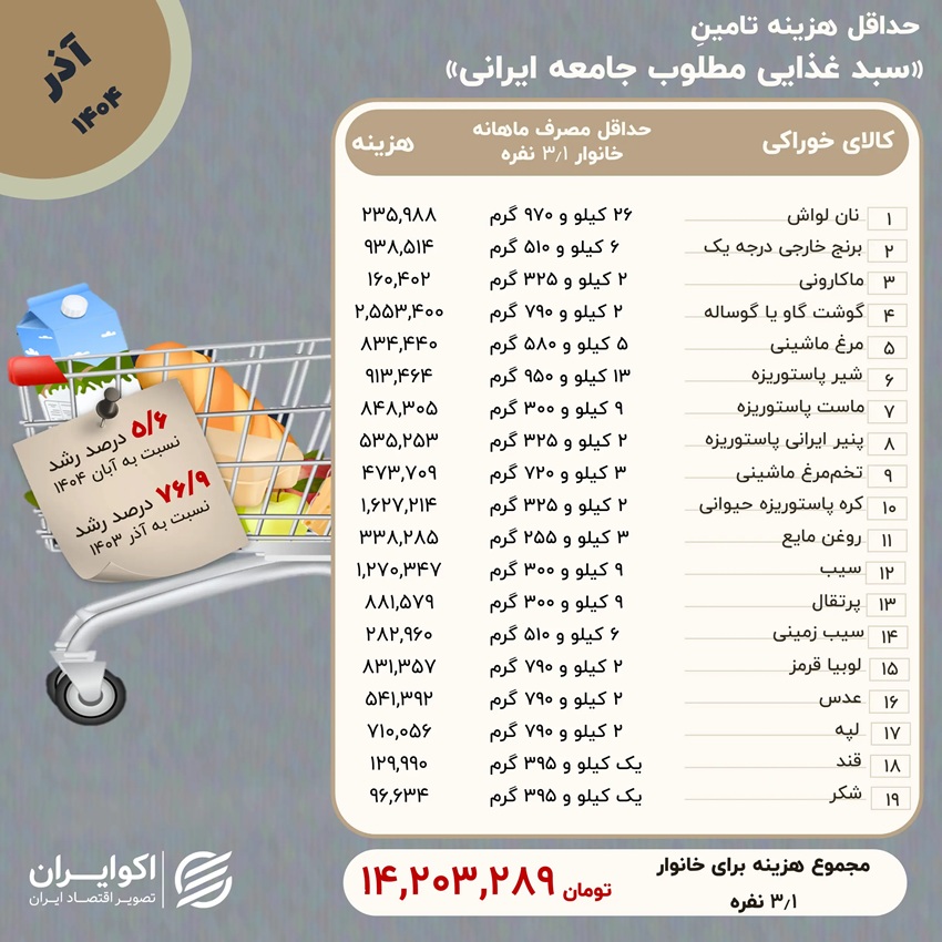حال اگر همین سبد را برای هر خانوار بهطور متوسط ۳.۱ نفره مورد محاسبه قرار دهیم مقدار مخارج به مقدار ۱۴ میلیون و ۲۰۳ هزار تومان خواهد رسید. هزینه مورد نیاز برای تامین این سبد در آذر امسال نسبت به مهرماه ۵.۶ درصد و در مقایسه با مدت مشابه در سال گذشته ۷۶.۹ درصد زیادتر شده است.
