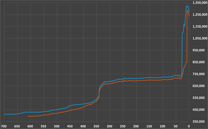 نمودار زیر تغییرات قیمتی اسکناس و حواله دلار را طی ۷۰۰ روز گذشته به ترتیب با خطوط آبی و نارنجی نشان میدهد که خود حاکی از افت بیش از ۵۰۰۰ تومانی در نرخ دلار است.