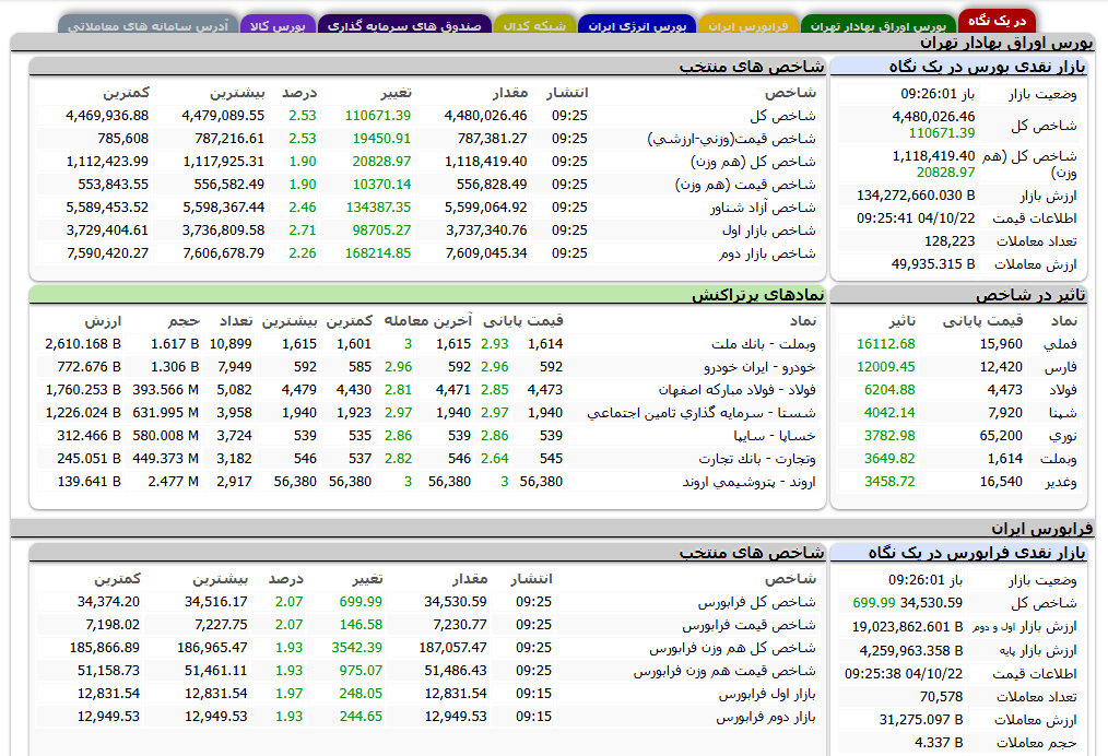 بورس تهران در روز دوشنبه ۲۲ دی ۱۴۰۴ با جهش چشمگیر ۱۱۰ هزار واحدی کار خود را آغاز کرد و شاخص کل با رشد ۲.۵۳ درصدی به به رقم ۴,۴۸۰,۰۲۶.۴۶ واحد رسید.