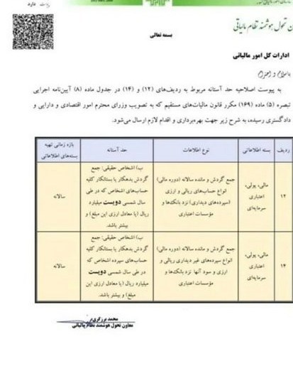 حد آستانه گردش کلیه حسابهای اشخاص حقیقی مرتبط با آیین نامه ماده 169 قانون مالیاتهای مستقیم تعیین شد.