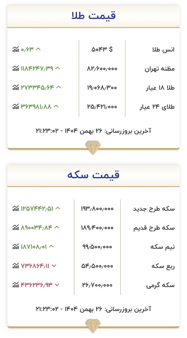 آخرین قیمت طلا و سکه در پایان معاملات ۲۶ بهمن