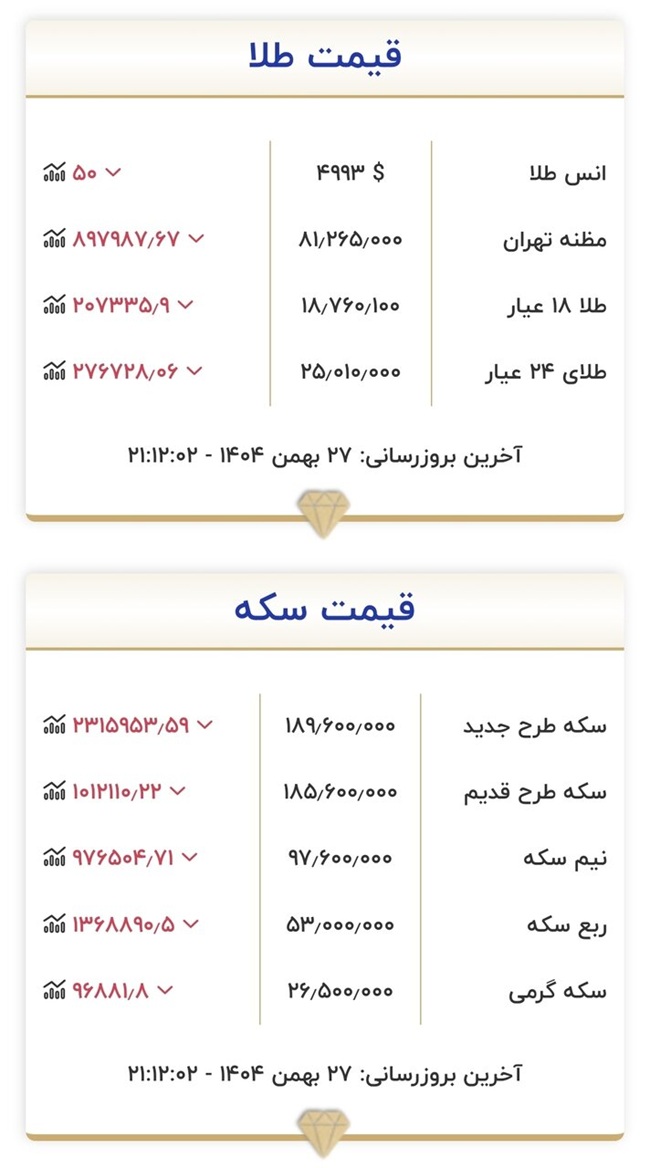 آخرین قیمت طلا و سکه در پایان معاملات ۲۷ بهمن