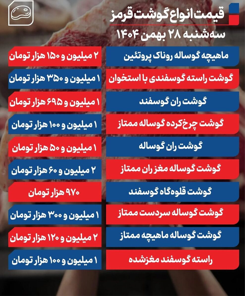 قیمت گوشت قرمز برای امروز سهشنبه ۲۸ بهمن ۱۴۰۴ اعلام شد.