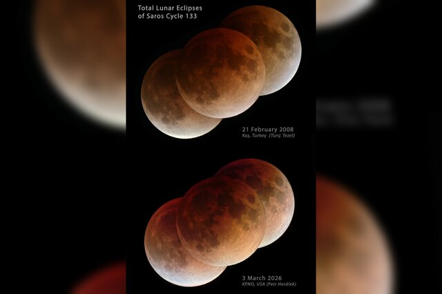به نقل از ناسا، عکس بالا از تصاویر ثبتشده در فوریه ۲۰۰۸ تشکیل شده است؛ در حالی که تصویر پایین، ماهگرفتگی کامل را در مارس ۲۰۲۶ نشان میدهد.