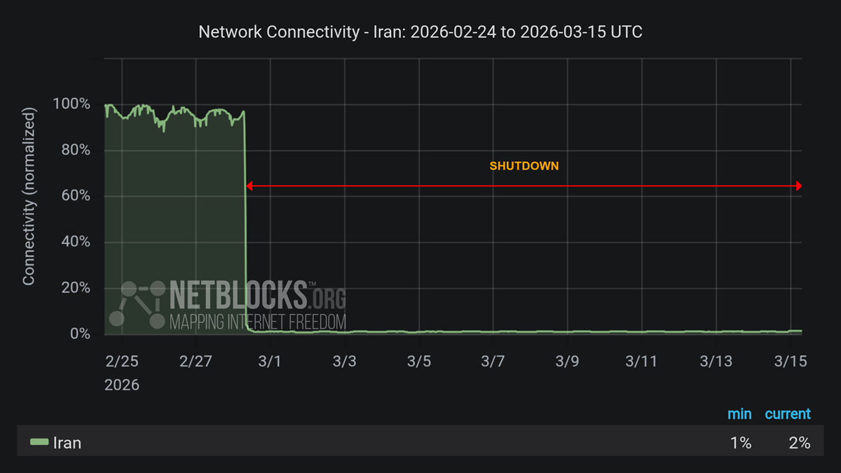 جهان صنعت نیوز، بر اساس دادههای وبسایت «نتبلاکس» که میزان اتصال به اینترنت (شبکه جهانی) را نشان میدهد، سطح اتصال تا پایان فوریه (دو روز بعد از آغاز جنگ اسرائیل و آمریکا علیه ایران) در نزدیکی سطح عادی و حدود ۱۰۰ درصد قرار داشت، اما در اواخر این ماه با کاهش شدیدی به حدود ۵۰ درصد میرسد و در ادامه تا اواسط مارس با نوسانهای مقطعی در سطوح پایینتر ادامه مییابد.