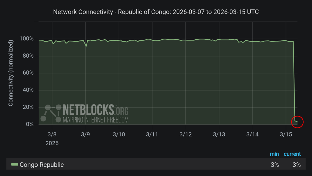 همچنین وبسایت نتبلاکس در صفحه نخست خود به میزان اتصال شبکه در جمهوری کنگو پرداخته است که طی یک هفته گذشته و در بیشتر این بازه زمانی در سطحی پایدار قرار دارد، اما در صبح روز ۱۵ مارس (روز گذشته) با کاهش شدیدی مواجه شده است.