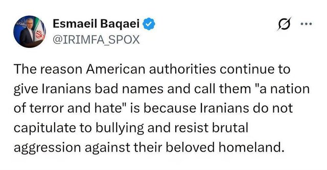 جهان صنعت نیوز، اسماعیل بقائی سخنگوی وزارت امور خارجه در مطلبی در شبکه اجتماعی ایکس نوشت: دلیل اینکه مقامات آمریکایی مدام به ایرانیان توهین میکنند و آنها را «ملت ترور و نفرت» مینامند چیزی نیست جز اینکه ایرانیان در برابر قلدری سر خم نمیکنند و در برابر تجاوز نظامی جنایتکارانه به میهن عزیزشان، دفاع میکنند.