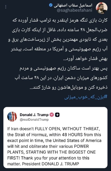 پس بهتر است ساکنان رژیم صهیونیستی و مردم کشورهای میزبان دشمن ایران، در این ۴۸ ساعت آب ذخیره کنند و موبایل‌هاشون رو شارژ کنند.»