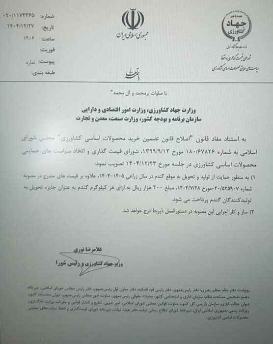 معاون امور زراعت وزارت جهاد کشاورزی از ابلاغ قیمت خرید تضمینی گندم بین ۴۷ هزار و ۵۰۰ تا ۴۹ هزار و ۵۰۰ تومان برای سال زراعی جاری ( ۱۴۰۵ - ۱۴۰۴ ) خبر داد.