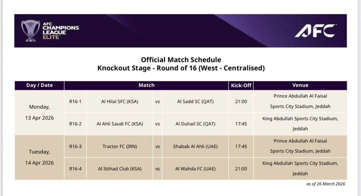 جهان صنعت نیوز، با اعلام کنفدراسیون فوتبال آسیا دیدار تراکتور و شباب الاهلی امارات در مرحله یک هشتم نهایی لیگ نخبگان روز سه شنبه ۲۵ فروردین ساعت ۱۸:۱۵ (به وقت ایران) در ورزشگاه فیصل بن فهد شهر جده برگزار خواهد شد.
