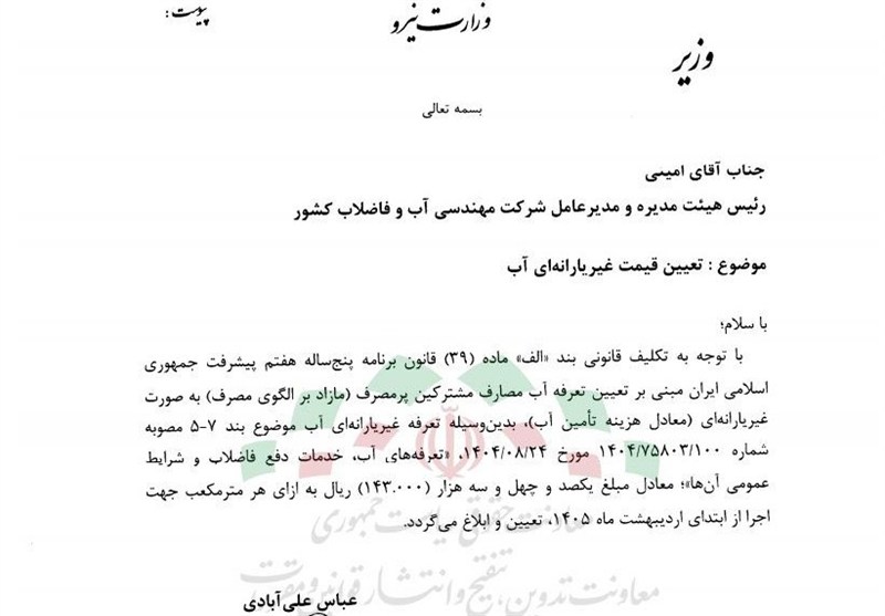 جهان صنعت نیوز، عباس علیآبادی وزیر نیرو در نامهای خطاب به مدیرعامل و رئیس هیئتمدیره شرکت مهندسی آب و فاضلاب کشور، تعرفه غیریارانهای آب برای مشترکان پرمصرف را اعلام کرد. این ابلاغیه با شماره ۱۴۰۴/۱۰۹۸۶۸/۱۰۰ در تاریخ ۲۷ اسفند ۱۴۰۴ صادر شده است.
