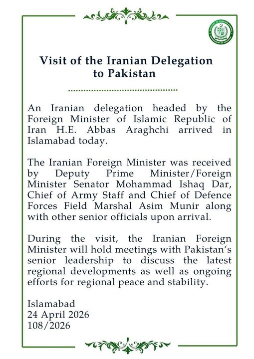 جهان صنعت نیوز، در این بیانیه آمده است : «هیأت جمهوری اسلامی ایران به ریاست جناب آقای سید عباس عراقچی، وزیر امور خارجه امروز وارد اسلامآباد شد.