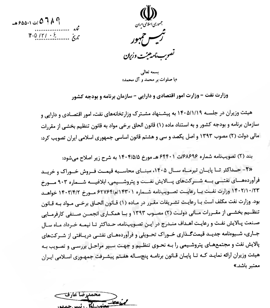 بر اساس این مصوبه تا پایان تیرماه امسال مبنای محاسبه نرخ فروش خوراک به شرکتهای پتروشیمی و نرخ خرید فرآوردههای نفتی از پالایشگاهها به قیمت مصوب هیأت وزیران در مرداد ۱۴۰۳ که از سوی وزارت نفت در دی ماه همان سال به شرکتهای پتروشیمی و پالایشی ابلاغ شده و در سامانه کدال بازگذاری شده بود، تعیین شده است.